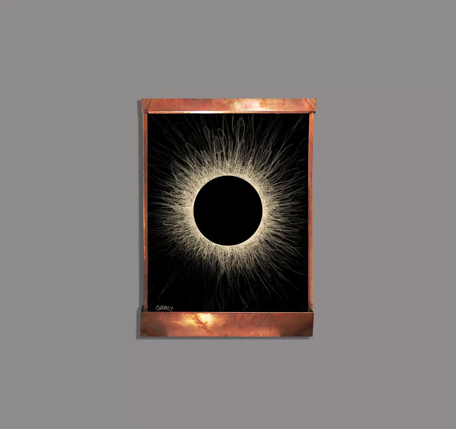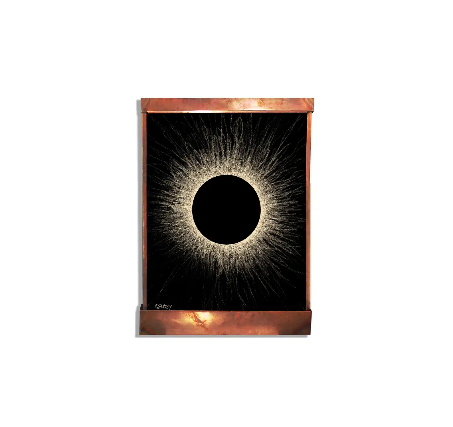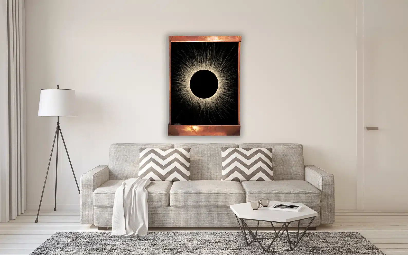 Since the dawn of time, an eclipse has been a source of mystery and magic in the minds of men. Here you can feel a sense of that in our wall fountain. 48″ tall, 36 wide, and 6″ deep this comes with everything you need to hang and run it. An LED light hood can be purchased separately. Ask us about custom sizes.