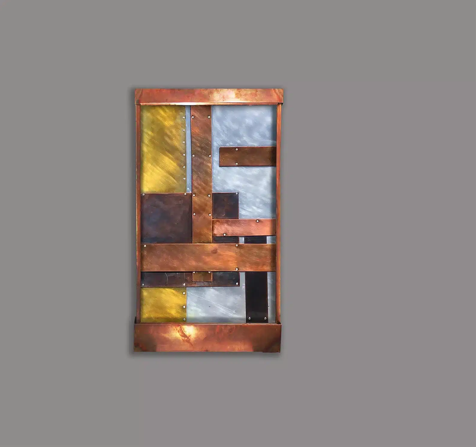 This is a powerful, high tech design. This originated as a custom order for an engineering firm, and we liked it so much that we added it to our collection. This is made of aluminum, copper, and bronze. The rivets here add a beautiful architectural detail mixing the functional with the aesthetic. A piece of clear acrylic sheet covers th metal so the water will never touch nor tarnish it. It is 48″ tall, 28″ wide, and 6″ deep, but can be made in any size. The original one was 6′ tall and 4′ so the sky is the limit with this one. An LED light hood is available upon request.