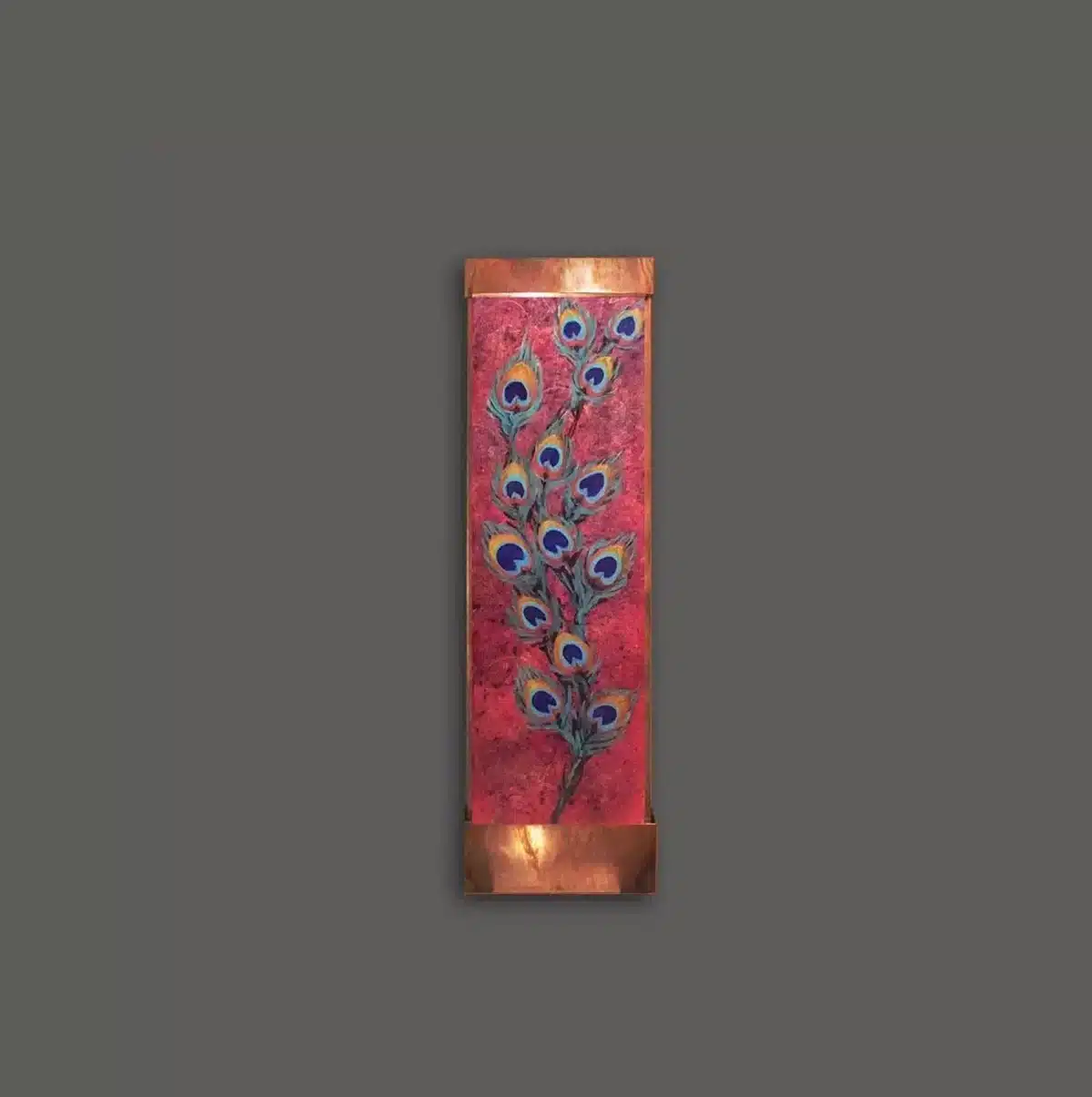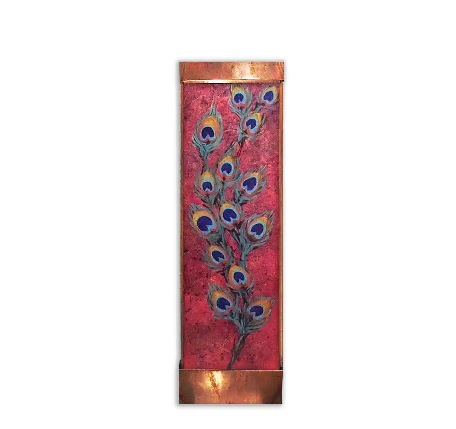 Gardens of Jaipur is our latest wall fountain from Harvey Gallery. Borrowing from the colors and themes of India, this fountain will bring a beautiful, exotic touch to any room. The fountain is hand-painted and can have LED back lights or an LED light hood added to it. It comes with everything you need for it to run. Half of what we do is custom, so we can make this in a variety of sizes, shapes, and colors.