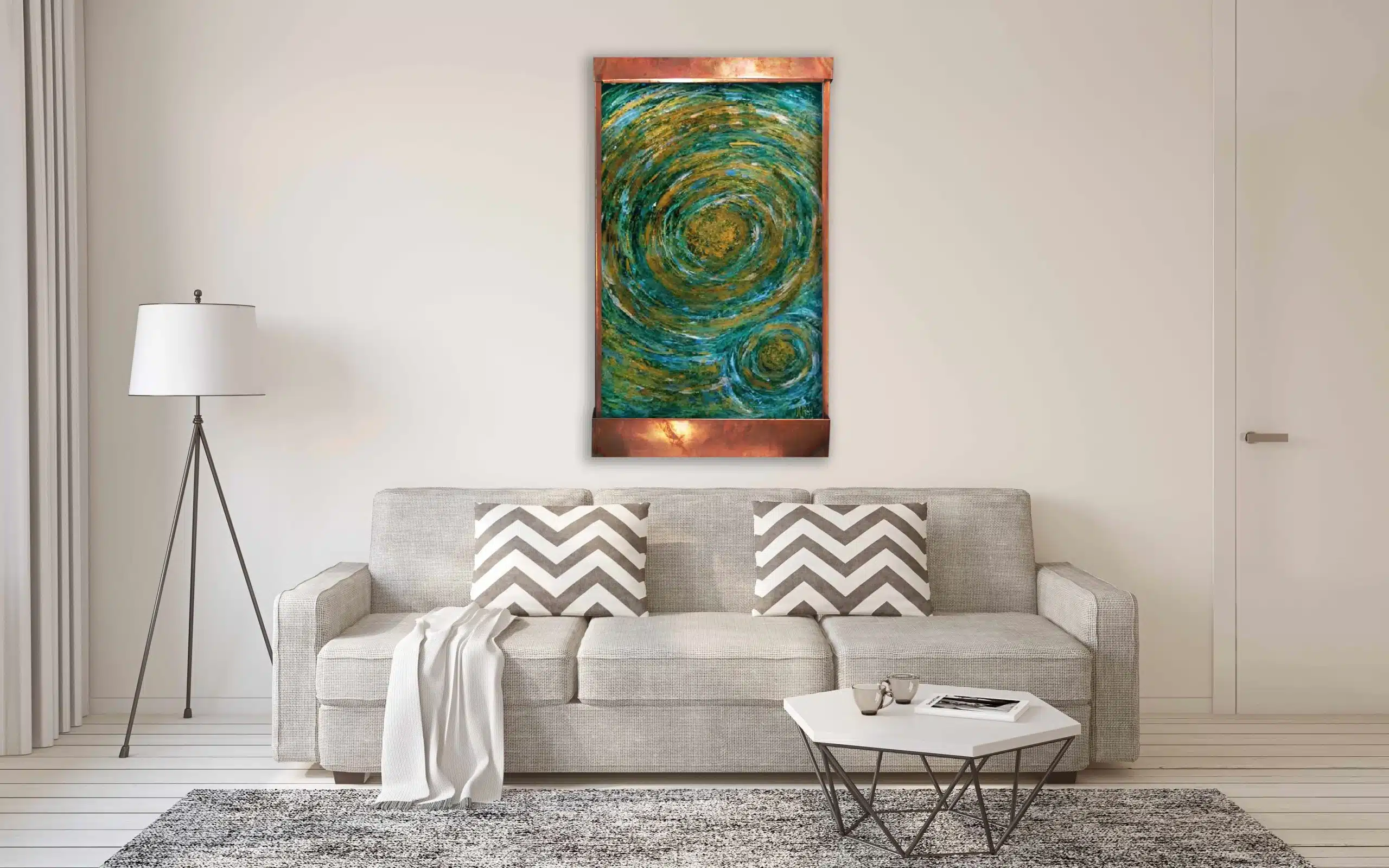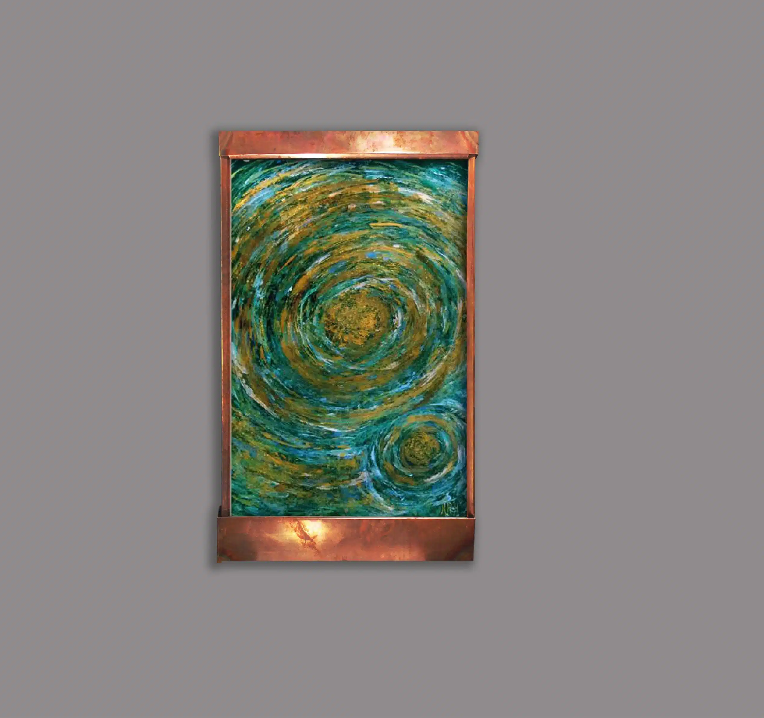 We were really torn as to what to name this new fountain. When I finished it, I kept seeing it as something an astronaut might see from 50 miles up. To me, it looked like a big typhoon over the Pacific Ocean. But what would I call it then…Typhoon Pacific? Someone suggested that it looks like what the genesis of the earth might have been. Sooo…Genesis, it is. Kinda Zen that a typhoon and Genesis would look alike! This is 48″ tall, 28″ wide, 6″ deep and comes with everything needed to hang and run. An LED light hood can be purchased