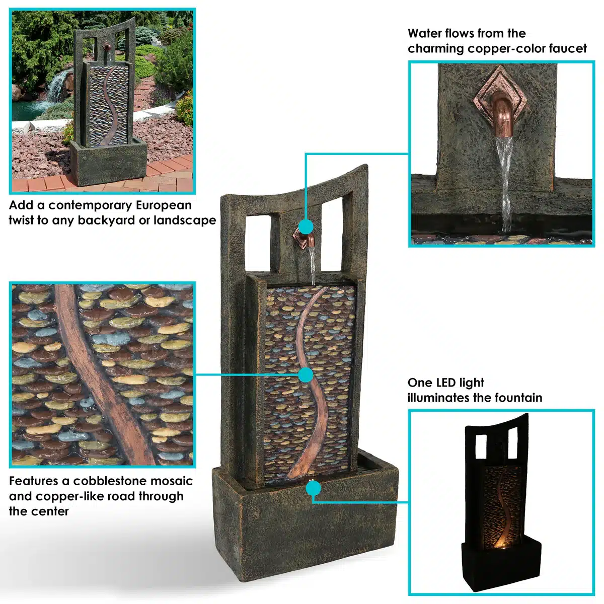 Bring a unique modern centerpiece to your space with this electric outdoor water fountain. Relax to the peaceful sounds as water pours out of the top faucet and then gently cascades down the cobblestone mosaic design. Also, no complicated plumbing is required. Simply fill with water, plug in the included pump, and experience the mesmerizing charm of this electric outdoor water fountain.