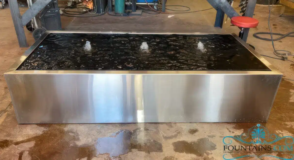 This stainless reflection pool is a charming fountain with a truly modern design. Delight your guests and visitors with the “Infinity Pool” design. Water spills evenly over all four edges of the basin before dropping back into the pool, creating the illusion of a space without boundaries. A series of bubblers allow water to rise 3-4 inches above the surface of the water, and can be adjusted high or low so you can achieve the effect you want to achieve. Add lighting and you get a truly breathtaking, memorable piece.
